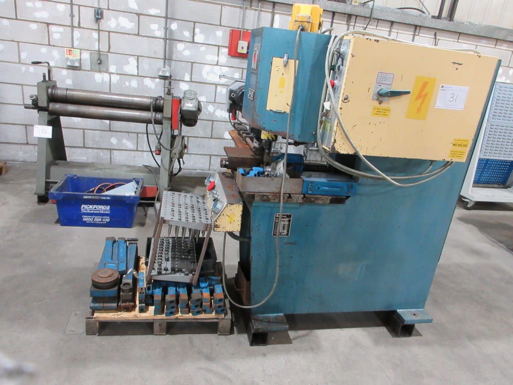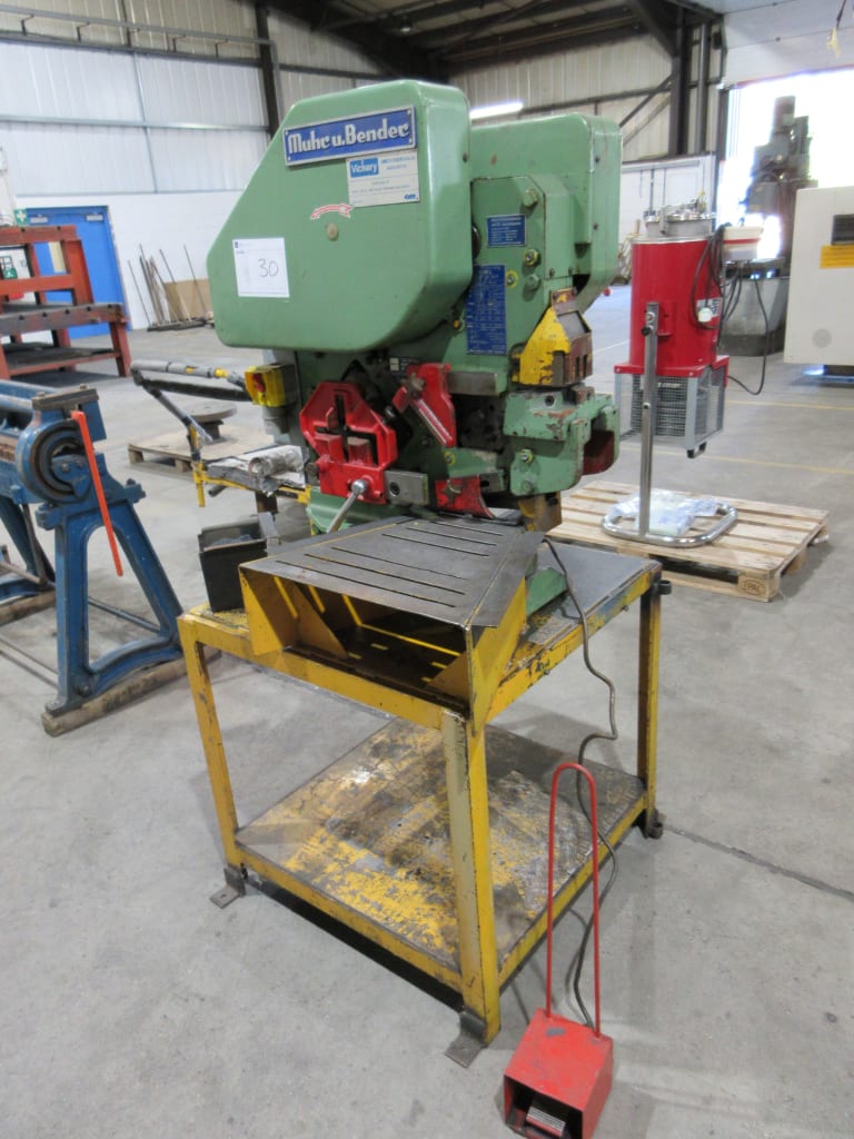 - Mubea 'BF30-12F' Sheet Metal & Profile Shear with Notches on Fabricated Stand (1977)Max Capacity for Bar Shear: Ø30mm Round, 28mm Square; For Flat Bar 100mm x 12mm; Foot Switch Control; GEC 1.5kW Motor; 415 Volt; S/No. 43631.