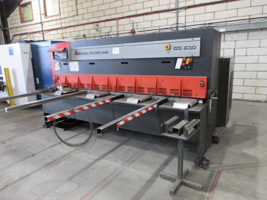 - Amada Promecam GS 630 Hydraulic Guillotine with Amada CNC Touch Screen Control (1998)Cutting Length 3,050mm; 197kN Capacity; 160mm Stroke Course; Max Thickness 6mm Mild Steel, 4mm Stainless; 40 ° Cutting Angle; Front Sheet Supports Approx 1,700mm Long; Foot Switch Control; S/No. C98 06 04.